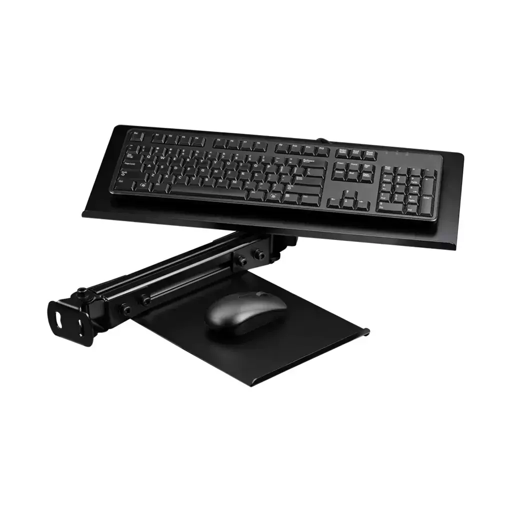 La bandeja para teclado y ratón Elite ensamblada con aluminio anodizado negro y componentes de acero al carbono ofrece la posibilidad de ajustar la altura, el ángulo y la articulación, lo que la convierte en la actualización perfecta para las cabinas de la serie Elite.